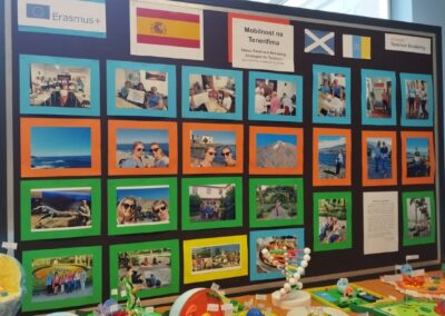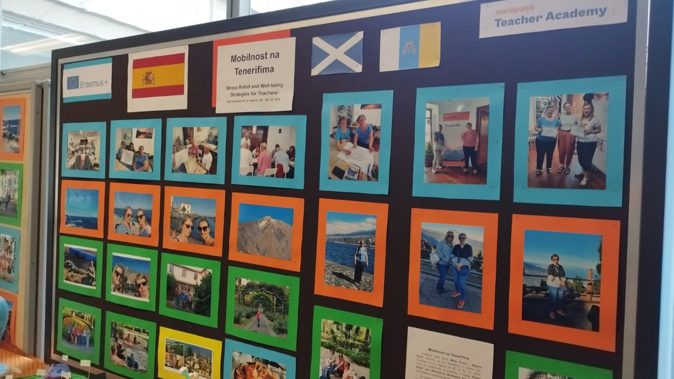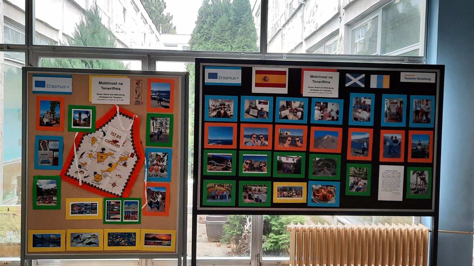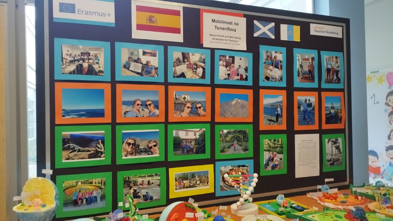 U predvorju naše škole otvorena je foto-izložba posvećena mobilnosti učiteljica Biljane Pavić i Mirte Ćosić, koje su u razdoblju od 20. do 25. listopada 2025. godine sudjelovale na stručnom usavršavanju na Tenerifima. Tema mobilnosti, “Strategije za ublažavanje stresa i dobrobit učitelja”, naglašava važnost brige o mentalnom zdravlju, ravnoteži i osobnom razvoju u učiteljskom pozivu.